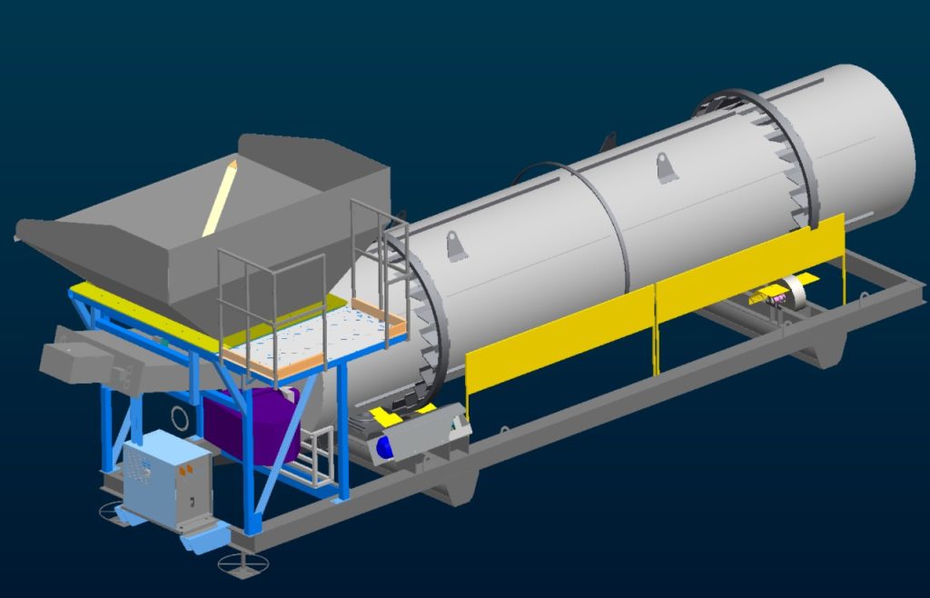 Бункер толкатель напрямую подает окалину во вращающуюся камеру сгорания. В камере сгорания промасленая окалина, прокатная окалина перемешиваются и перемещаются при помощи лопастей, закрепленных внутри. Камера сгорания представляет собой трубу ф1620 мм. на 8000 мм и ф1920мм на 10000 мм. футерованную внутри нержавеющей сталью. Под воздействием факела горелки в присутствии атмосферного воздуха, нагнетаемого вентилятором горелки и дополнительным вентилятором наддува, при температуре 400-900 ⁰С происходит окисление углеводородов, содержащихся в сырье. Производительность установки регулируется частотой вращения трубы, количеством загружаемой промасленой окалины, прокатной окалины. Образующиеся в процессе термической утилизации газообразные продукты сгорания, проходят несколько стадий очистки. Объем камеры дожига специально рассчитан для экспозиции газов не менее 2 секунды, это позволяет за счет действия высоких температур разложить токсичные и вредные газы для предотвращения перегрева используются радиаторные ребра теплопередачи. Так же система сухой очистки представлена циклоном грубой очистки газов, оборудованным бункером для сбора отсепарированной твёрдой фазы. Модуль «мокрой» очистки газов оборудован системой принудительного орошения отходящих газов, заправочной и сливной горловинами и люками для очистки осадка. Не уловленные ранее частицы, попадая под струи жидкости, увлажняются и выпадают в осадок. Дымосос, создавая постоянную тягу, поднимает газы вверх. Поднимаясь выше, газ попадает под следующий распылитель, где переходят в водный раствор более мелкие частицы. Таким образом, на выходе из скруббера получается газ, охлаждённый и очищенный от несгоревших механических частиц. Перед выходным патрубком скруббера предусмотрен каплеотбойник, на который конденсируются водяные пары, тем самым предотвращается их попадание в атмосферу вместе с очищенным газом. Циркуляционный насос откачивает жидкость из бака скруббера и снова подаёт на распылители.